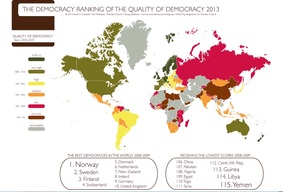 وقد عكفت المنظمة، التي تتخذ من "فيينا" مقرا لها، الديموقراطية. وفي المؤشر الأخير شمل التقييم ما مجموعه 115 بلدا باستخدام نهج علمي متعدد الأبعاد يدمج الجوانب السياسية وغير السياسية للمجتمع، مثل الحرية، المساواة بين الجنسين، الاقتصاد، المعرفة، الصحة، والبيئة.