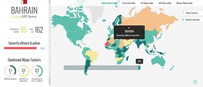 صنّف "مؤشر السلام العالمي" GPI في يونيو/حزيران 2013 البحرين ضمن أكثر 10 دول في العالم شهدت تراجعاً حادا في مستوى "السلام"، بين العامين 2009 و2013.