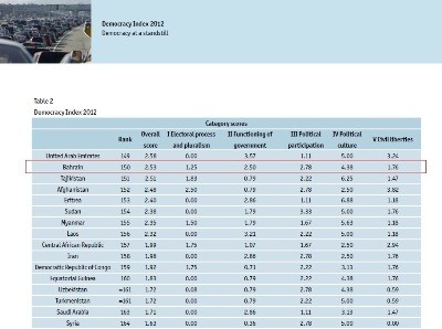 بحسب مؤشر الديمقراطية العالمي 2012، الذي أصدرته العام الماضي وحدة البحوث والمعلومات التابعة لمجلة الإيكونوميست البريطانية EIU، احتلت البحرين المرتبة 150 من بين 167 دولة، لتجدد مكانها بين الدول المتسلّطة (المستبدة) في العالم في ذيل القائمة، وصنّف النظام في البحرين على أنه من "الملكيات المطلقة".