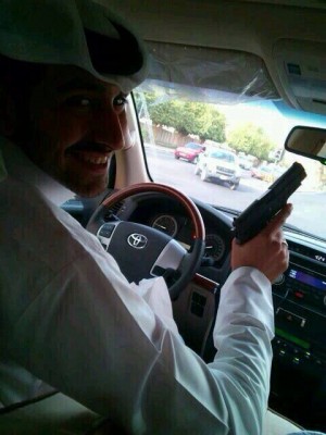 في الصور الجديدة له، يظهر محمد في قمرة سيارته فخوراً جداً بمسدسه. كان متجها لحظة التقاط الصورة إلى استاد البحرين الوطني الشهر الماضي (10 يناير/ كانون الثاني 2014).