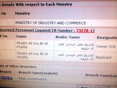 وبينت الوثائق التابعة إلى إدارة السجل التجاري بوزارة الصناعة والتجارة أن شركة (REDX CONSTRUCTION) التي ظهرت في الصور التي نشرت اليوم، أثناء قيام قوات الأمن بوضع الحواجز الخرسانية والتسديدات اللازمة في إطار الاستعدادات لذكرى 14 فبراير/ شباط، مملوكة إلى أحد أفراد العائلة الحاكمة.