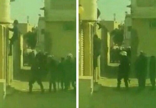 مرآة البحرين: صور مختلفة لسلوكيات قوى النظام البحريني هذا اليوم، وقد التقطت صورة في قرية المصلى غرب العاصمة البحرينية المنامة ﻷحد أفراد مكافحة الشغب وهو يتسلق حائط منزل أحد المواطنين محاطا بمجموعة من العساكر.