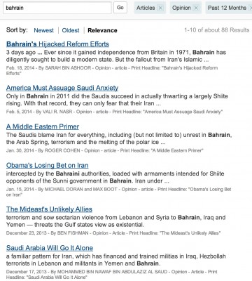 أولًا، وكما أشير مسبقًا، هذه الافتتاحية ليست الأحدث في سلسلة الافتتاحيات المشبوهة حول البحرين التي ظهرت في الصحيفة خلال الأشهر الستة الماضية أو نحو ذلك. وكما يستنتج المرء من اللقطات أدناه، فإن أحدث أربع افتتاحيات عن البحرين من أصل ستة، يرجع تاريخها إلى منتصف كانون الأول/ديسمبر، تنشر فكرة أن الدعم (المادي) الإيراني للمعارضة البحرينية ليس فقط حقيقة، بل إنه لا يختلف نوعيًا عن تورط البلد في سوريا واليمن. وتجنب فقط فالي نصر، الباحث في الحركات السياسية الشيعية، وروجر كوهين كاتب عمود في صحيفة نيويورك تايمز، هذا الخلط، وقد أظهر كوهين (بسخرية) هذا التضليل الذي ترعاه السعودية.