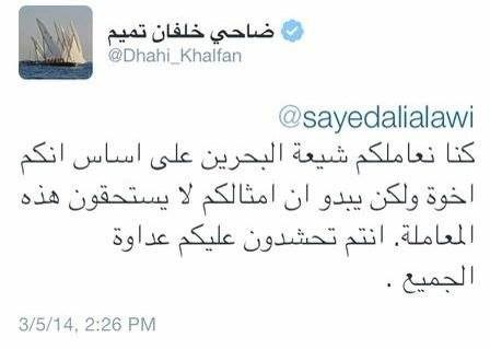 مرآة البحرين: شن نائب رئيس الشرطة والأمن العام في إمارة دبي الفريق ضاحي خلفان، هجوماً شديداً على الطائفة الشيعية في البحرين، وقال إنهم "لايستحقون أي نوع من أنواع المعاملة الأخوية".