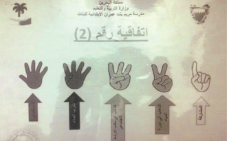 وقالت الصحيفة "تقليد جديد وغريب اتبعته مدرسة مريم بنت عمران الابتدائية للبنات بمحافظة المحرق، ألا وهو طباعة لوحة تعريفية تتضمن إشارات لأصابع اليد تتعامل بها الطالبات مع المعلمات في الصف الدراسي، وتم تعميم هذه الإشارات على جميع الفصول بالمدرسة من الصف الأول إلى السادس الابتدائي، لتصبح بمثابة الاتفاقية بين المعلمة والطالبات".