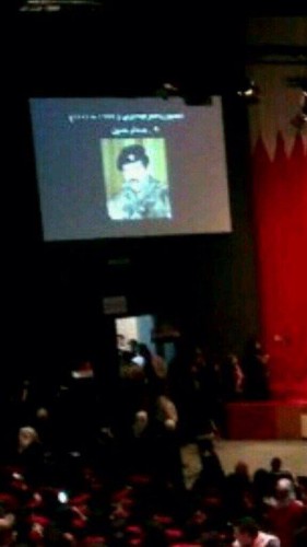 "صدام حسين شهيد وقائد عظيم". هكذا قدمه حفل في جامعة البحرين الوطنية صباح هذا اليوم وسط تفاعل كبير من الطلبة والطالبات المقيمين والبحرينيين الموالين للحكومة البحرينية.