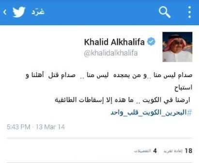 وكان كويتيون قد عبروا عن غضبهم لتمجيد صدام في مؤسسة حكومية بحرينية، مطالبين الحكومة البحرينية بموقف واضح من "الرئيس المقبور الذي غزا الكويت مطلع تسعينات القرن الماضي".