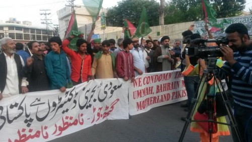 المتظاهرون رفعوا شعارات تعبّر عن غضبهم ﻻستمرار انتهاكات حقوق الإنسان في البحرين والتعاون اﻷمني بين الحكومة الباكستانية والمنامة، ورفعوا صورا للملك البحريني كتب عليها "القاتل"، مشددين على أن التواجد العسكري السعودي هو أحد أسباب تعقيد الأزمة السياسية بالبحرين.