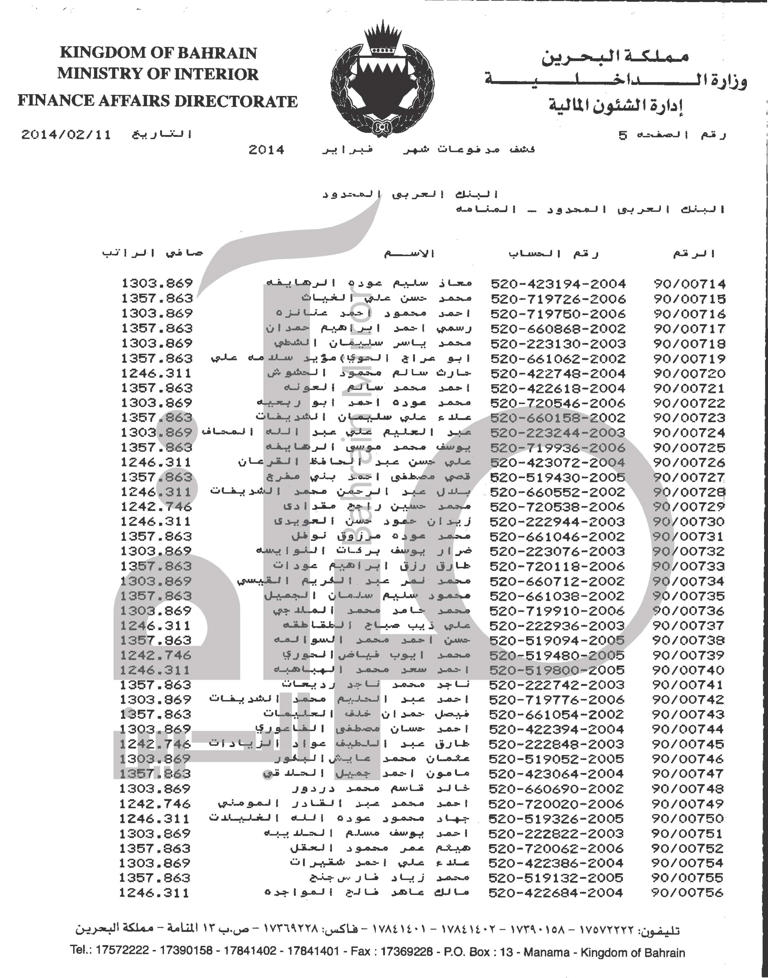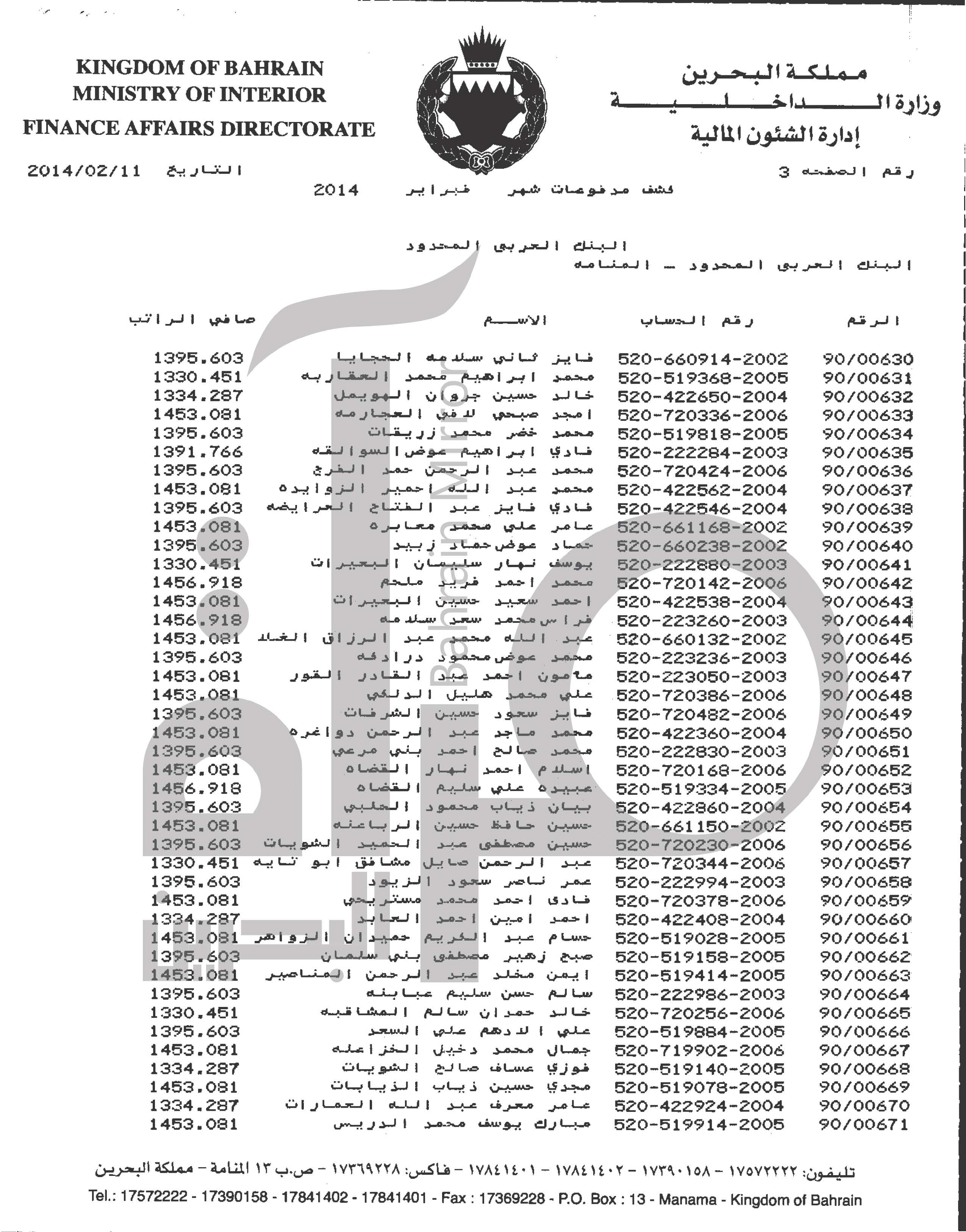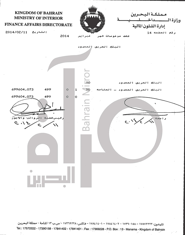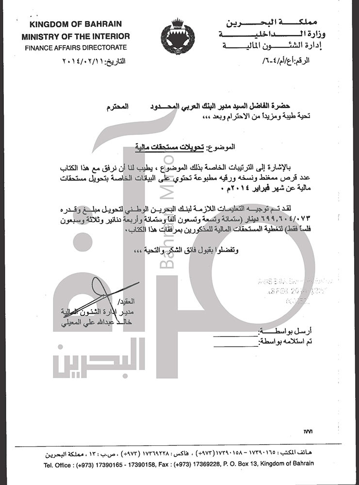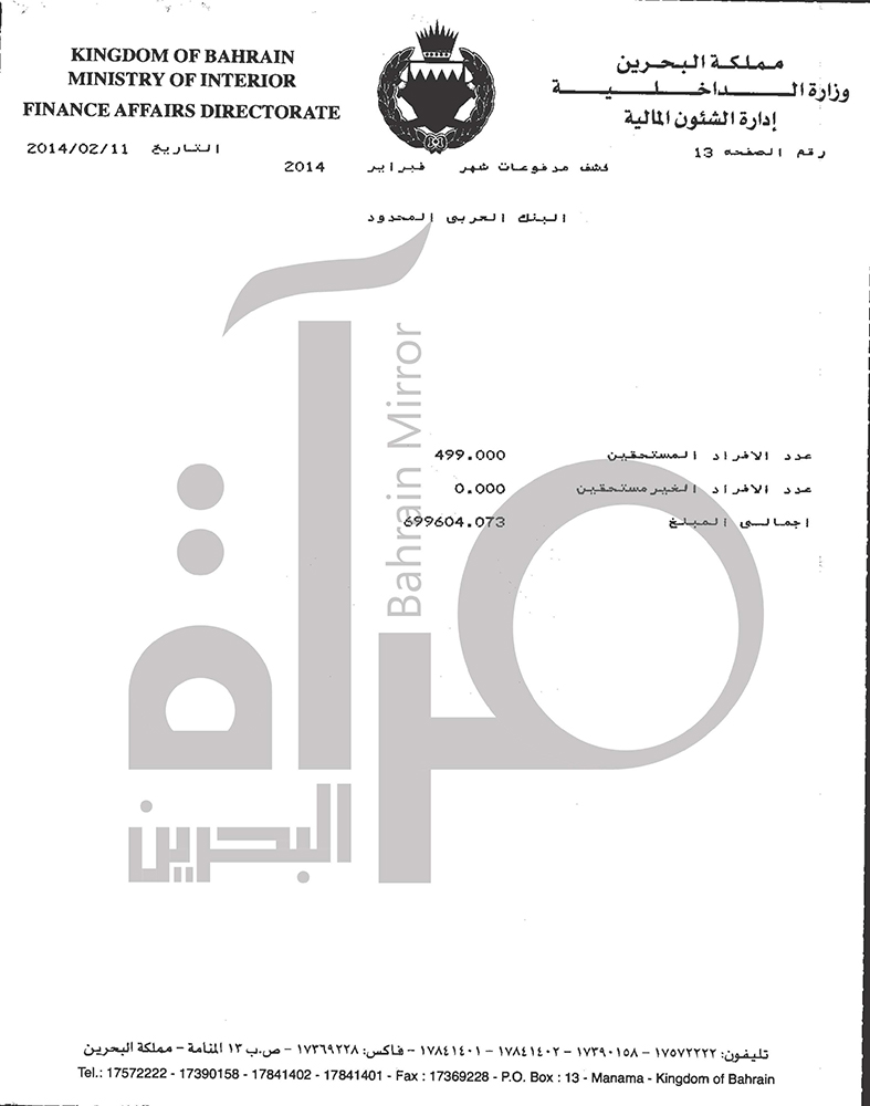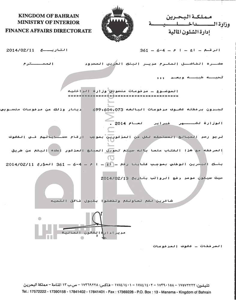 وتقول إحدى الرسائل المؤرخة في 11 فبراير/ شباط 2014 تحت الرقم "اع-ام-4-6-361" بعنوان "مستحقات منسوبي وزارة الداخلية": "تجدون برفقته كشوف مدفوعات البالغة 699.604.073 دينار (ستمائة وتسعة وتسعون ألفاً وستمائة وأربعة دنانير وثلاثة وسبعون فلساً) وذلك عن مدفوعات منسوبي الوزارة لشهر فبراير لعام 2014".
