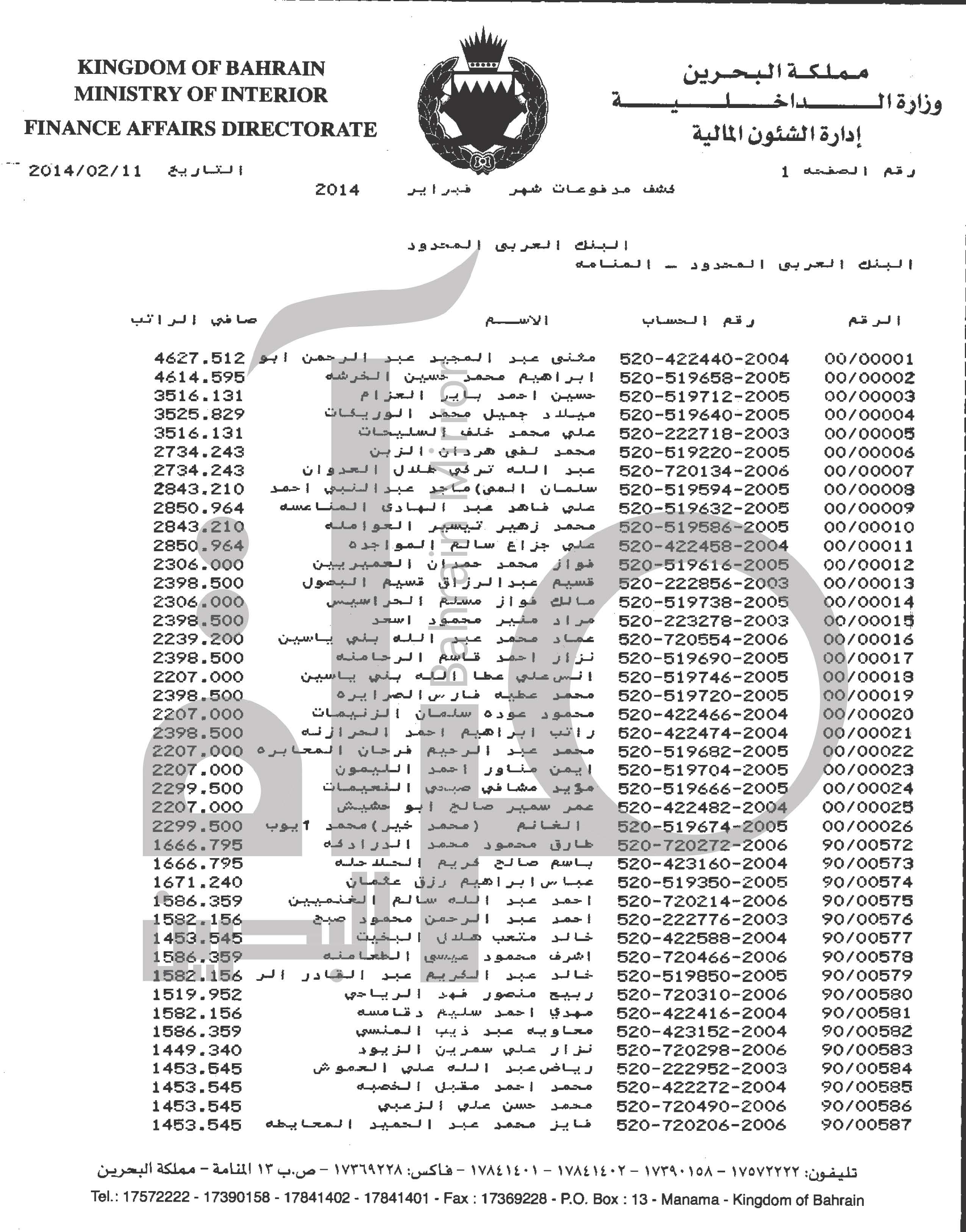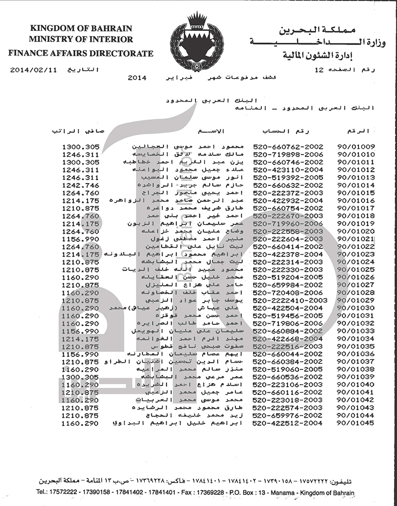 وتظهر الوثائق الصادرة عن وزارة الداخلية البحرينيّة بتاريخ (11 فبراير/ شباط 2014) والتي تنشرها "مرآة البحرين" كاملة، أسماء جميع قوات الدرك المتواجدين في البحرين الذين أظهرت الوثائق أيضاً بأنه تمّ استدماجهم ضمن كادر الوزارة، إضافة إلى الرواتب المخصّصة لهم وأرقام حساباتهم البنكية.