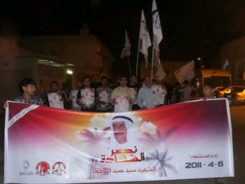 مرآة البحرين: نظم "تيار الوفاء الإسلامي" أمس الأحد مسيرة في بلدة سار في الذكرى السنوية الثالثة لاستشهاد الحاج الشهيد السيد حميد محفوظ (57 عاماً) الذي قتلته قوات الأمن يوم 6 أبريل/نيسان 2011 في "ميدان الشهداء".