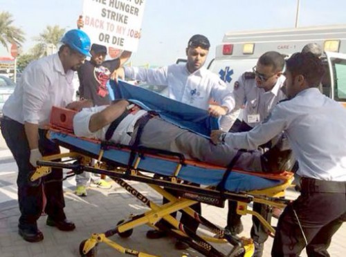 مرآة البحرين: نقلت سيارة الإسعاف أمس الخميس المواطن البحريني أحمد ميثم، المضرب عن الطعام منذ 11 يوماً أمام شركة ألمنيوم البحرين (ألبا)، بعد أن سقط مغشياً عليه، وذلك للمطالبة بإرجاعه للوظيفة.