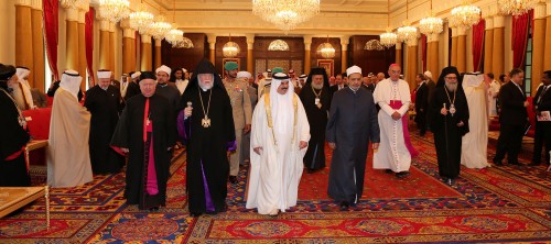 واستقبل الملك في أحد قصوره اليوم الإثنين (5 مايو/ أيار 2014) بحضور عمه رئيس الوزراء خليفة بن سلمان آل خليفة ونجله ولي العهد سلمان بن حمد آل خليفة المشاركين في مؤتمر حوار الحضارات والثقافات الذي انطلق اليوم في المنامة.