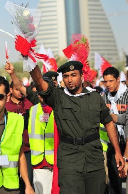 عندما سمع الشرطي علي جاسم الغانمي- 26 عامًا- متأهل وله أولاد- أن قوات الأمن أطلقت الرصاص على المتظاهرين في 17 شباط/فبراير 2011، توجه مباشرة إلى مجمع السلمانية الطبي لمساعدة الأطباء الذين يعالجون الجرحى هناك. عندما رأى آثار العنف بأم عينه، غادر مكان عمله بلباسه العسكري وانضم إلى المحتجين وأعلن أنه لم يعد يستطيع دعم للنظام. رفع المحتشدون الغانمي فوق الأكف وأصبح بين عشية وضحاها بطل حركة الاحتجاجات.