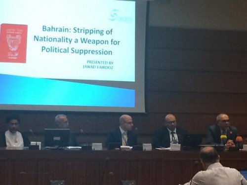 مرآة البحرين (خاص): قال رئيس منظمة سلام البحرين لحقوق الإنسان جواد فيروز في ورقة قدمها بعنوان "الجنسية البحرينية.. حق وليس منةّ" في ندوة على هامش الجلسة 26 لمجلس حقوق الإنسان في جنيف الجمعة 13 يونيو 2014، أن قرار اسقاط جنسية 31 مواطناً يتطلب موقفا دوليا حازما من خلال الأمم المتحدة، بإلزام النظام في البحرين بإلغاء قرار سحب الجنسية فوراً وفي حال عدم التنفيذ تحويل الملف الى مجلس حقوق الانسان التابع للأمم المتحدة، واستصدار قرار بمنع السلطة في البحرين من استخدام سحب الجنسية كأداة سياسية ضد المعارضين لها.