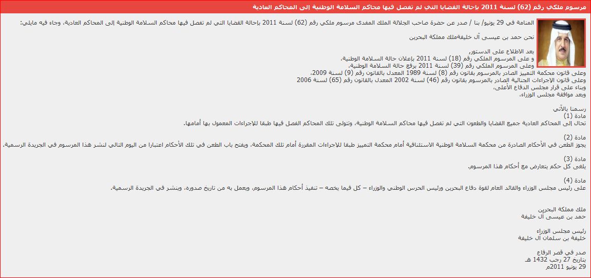 المنامة في 29 يونيو/ بنا / صدر عن حضرة صاحب الجلالة الملك المفدى مرسوم ملكي رقم (62) لسنة 2011 بإحالة القضايا التي لم تفصل فيها محاكم السلامة الوطنية إلى المحاكم العادية، وجاء فيه مايلي: