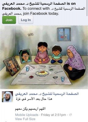 ويصور الرسم الكاريكاتيري الذي نشر في "مرآة البحرين" أما وابنها وابنتها متحلقتَيْن حول مائدة إفطار، واستعيض عن وجود الأب والابن الأكبر بصوريتهما، إذ أن الأول معتقل في سجون النظام والثاني شهيد، في تعبير عن حال كثير من الأسر البحرينية في شهر رمضان التي لا تخلو معظم بيوتها من شهيد أو معتقل. لكن العريفي الذي أعاد نشر الرسم كتب تحته "هذا حال بعض الأسر في غزة، اللهم ارحمهم وكن معهم"، رغم ظهور دوار اللؤلؤة في خلفية الكاريكاتير. وعلق أحد المدونين في صفة العريفي "نسي العريفي أن ينظر جيداً في الصورة ليرى أن المقصود هو الشعب البحريني الذي يسكت هو وأمثاله عن قتلهم لمجرد أنهم شيعة، وكأن ليس للشيعة حق بالحياة".