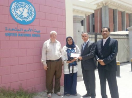 وسلم الخطاب، أمس الخميس (19 تموز/يوليو 2014) رئيس الجمعية بدرية علي إلى ممثل الأمم المتحدة الذي عبر عن تضامنه مع الشعب الفلسطيني ومع شهدائه ومعتقليه، ووعد بنقل خطاب الجمعية إلى الأمين العام للأمم المتحدة بأقرب فرصة ممكنة.