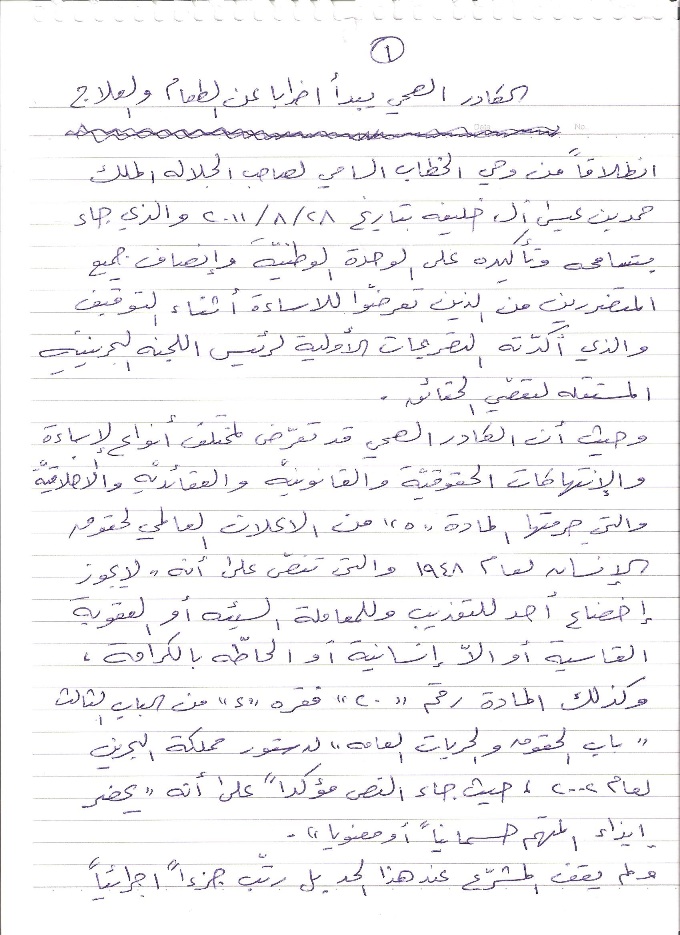 ونظراً لتأكيدات الكادر الصحي الموقع على هذا البيان أمام لجنة تقصي الحقائق ولجنة الأطباء الشرعيين على أن كافة الانتهاكات المشار إليها في الاتفاقية الدولية وفي نصوص مواد دستور مملكة البحرين الموضحة أعلاه والتي أفضت إلى إرغام الكادر على الاعتراف بجنح وجنايات خطيرة ليس لها أساس في الواقع وبعيدة كل البعد عن الدور المهني والإنساني الذي مارسه الكادر الصحي بجميع تخصصاته لتقديم الرعاية الإسعافية والتمريضية والجراحية لكافة المصابين في الأحداث المؤسفة التي وقعت في شهر فبراير ومارس 2011 دون استثناء أو تفريق عرقى أو طائفي.