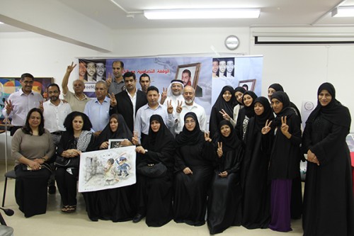 وتخلل الوقفة رسما كاريكاتوريا معبرا للفنان علي البزاز يظهر حرمان المعتقل الكفيف جعفر معتوق من العلاج.