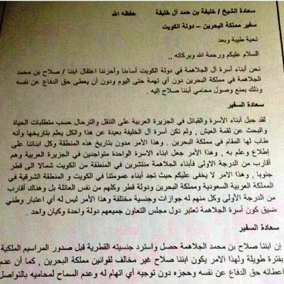 وأوضحت بأن "ابننا صلاح بن محمد الجلاهمة حصل واسترد جنسيته القطرية قبل صدور المراسيم الملكية بفترة طويلة ولهذا الأمر يكون ابننا صلاح غير مخالف لقوانين مملكة البحرين"، على ما جاء في الرسالة.