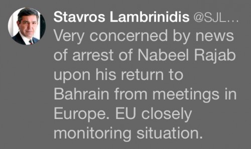 وقال لامبيرينيديز عبر حسابه الخاص في موقع التواصل الإجتماعي "تويتر" إن نبيل رجب "اعتقل بعد عقده اجتماعات في أوروبا"، مؤكداً أن "الاتحاد الأوروبي يراقب الوضع عن كثب.