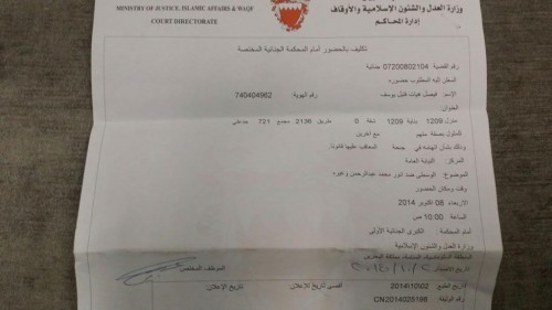 مرآة البحرين: تلقى الصحافي مٌقدِّم برنامج «شحوال» فيصل هيات، اليوم الثلاثاء 7 أكتوبر 2014، استدعاءاً رسمياً للحضور أمام المحكمة الجنائية الكبرى الأولى لجلسة محاكمة تعقد في العاشرة من صباح غد الاربعاء.