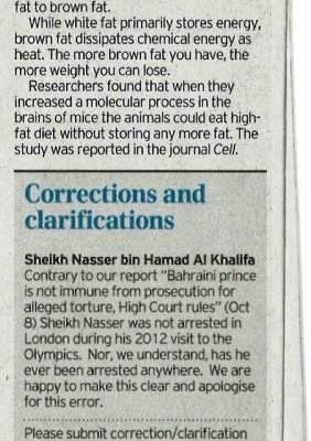 لا يعدو الأمر أن الصحيفة كانت قد كتبت في تغطيتها للحكم القضائي بتاريخ 8 أكتوبر 2014، بأن ناصر بن حمد "اعتقل في لندن خلال تواجده في الأولمبيات"، وحين عرفت بأن هذا الأمر غير صحيح، قامت بتصحيح هذه الجزئية والاعتذار عن الوقوع في مثل هذا الخطأ!