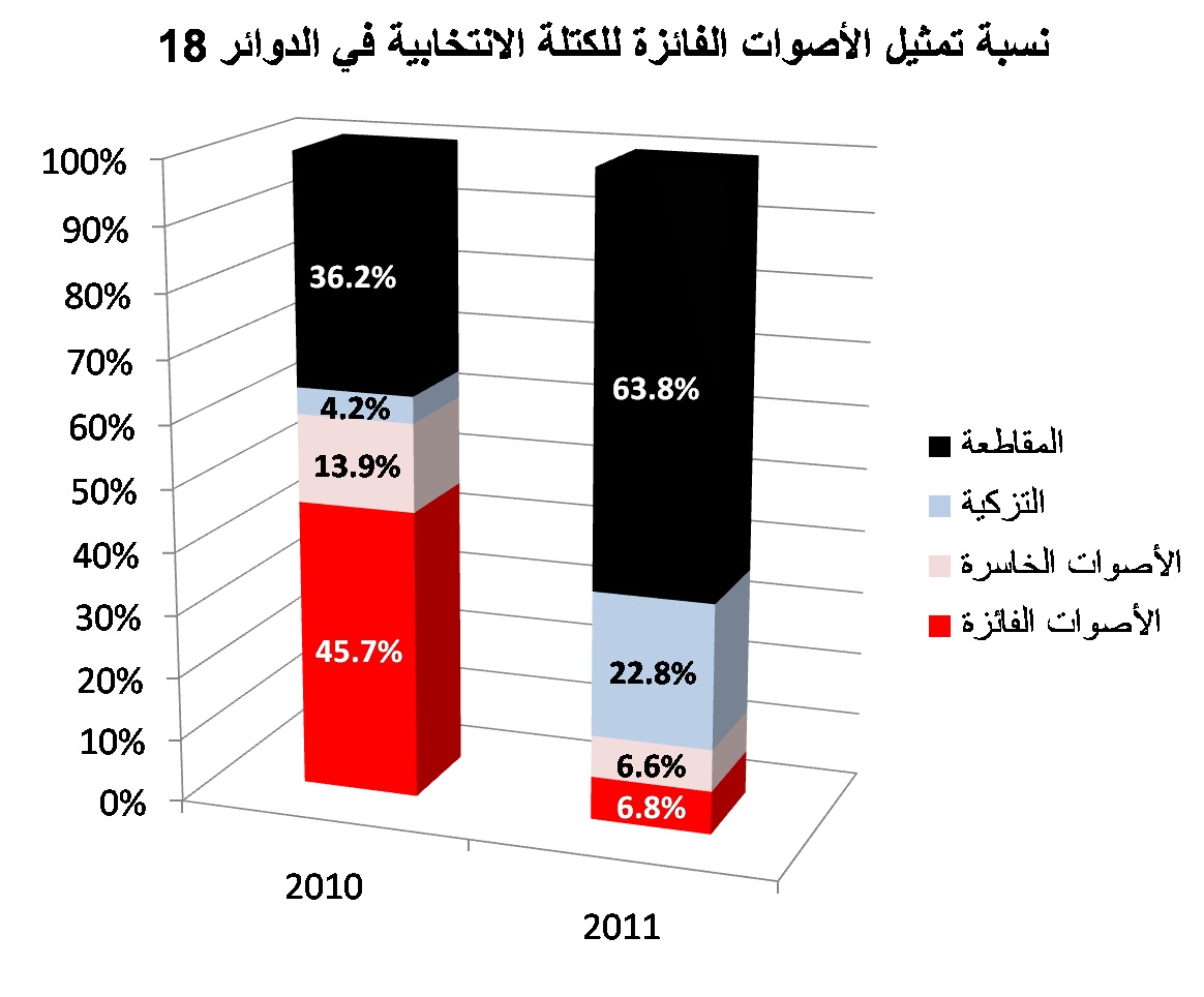 وقد رجحت الأقليات السنية الموالية للنظام فوز 8 مرشحين منها على حساب الغالبية الشيعية الساحقة والتي قاطعت الانتخابات مقاطعة كاسحة تحت شعار (صفروها) في كل الدوائر 18، ولم يفلح المرشحون الشيعة الموالون للنظام أو المدفوعون بنزعة الانتهازية والمصلحة الشخصية، في نيل الأصوات التي تؤهلهم للفوز، نتيجة لعزوف الناخبين الشيعة الكامل عنها، علاوة على كون هؤلاء المرشحين بالإضافة إلى الفائزين من تيار الموالاة بعيدين تمام البعد عن المزاج والخط السياسي العام لهؤلاء الناخبين في كل الظروف.