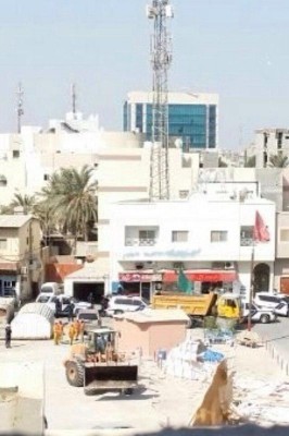 وأظهرت الصور محاصرة الأمن لمنطقة "الجفير" شرق العاصمة المنامة والتي تعد مقرا للقاعدة الأمريكة، قبل أن تستخدم الجرافات لهدم النصب.