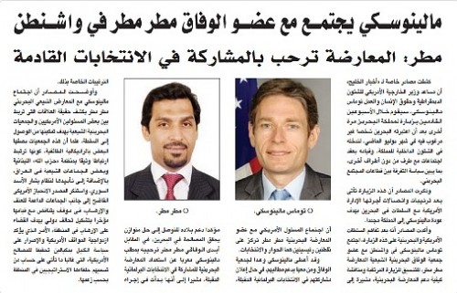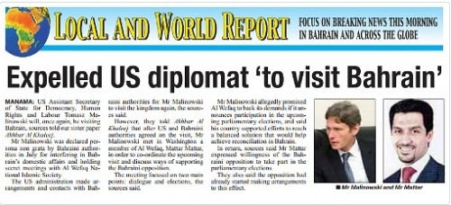 بحرين ووتش: نشرت صحيفة أخبار الخليج اليومية خبرًا في الصّفحة الأولى منها يزعم أنّ الدّبلوماسي الأمريكي توماس مالينوسكي التقى بمطر مطر، وهو عضو في جمعيّة الوفاق وأحد النوّاب الذين استقالوا من البرلمان في العام 2011 احتجاجًا على القمع الوحشي الذي مارسته الحكومة. اقتبس تصريح لمطر يُفيد أنّ الوفاق مستعدّة للمشاركة في الانتخابات النّيابية المقبلة بعد أنّ توعّد مالينوسكي بتلقّيها دعمًا لمطالبها من الولايات المتّحدة الأمريكيّة. وادّعت "المصادر الخاصّة" للصحيفة في المقال بأنّ هذا دليلٌ على مؤامرة تُدبّرها الولايات المتّحدة لجعل المعارضة الشّيعيّة "المتطرّفة والمذهبيّة" في موقع السّلطة. ونشر مطر لاحقًا تغريدةً على موقع تويتر ينفي فيها حدوث هذا اللّقاء وأصدر بيانًا صرّح فيه أنّ هذا الخبر المُفبرك يشكل إحدى محاولات النّظام "لإلهاء الرّأي العام عن المشاكل الحقيقية" التي تواجهها البحرين. ونشرت الوفاق أيضًا تصريحًا ينفي هذا الخبر على موقعها الرّسمي.