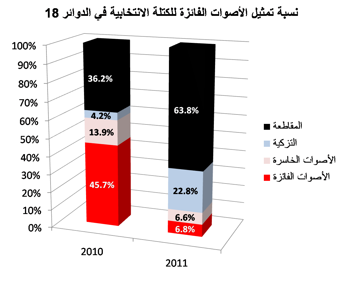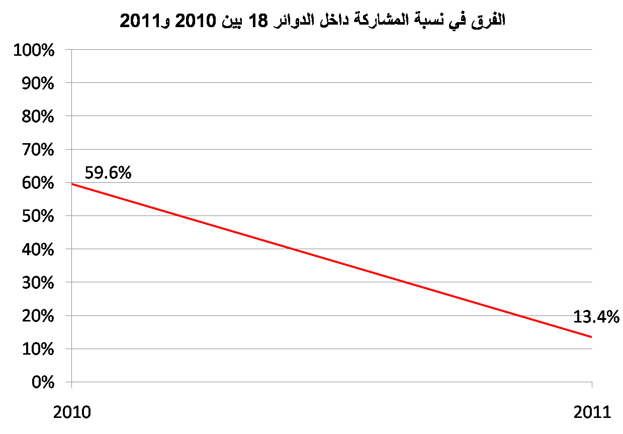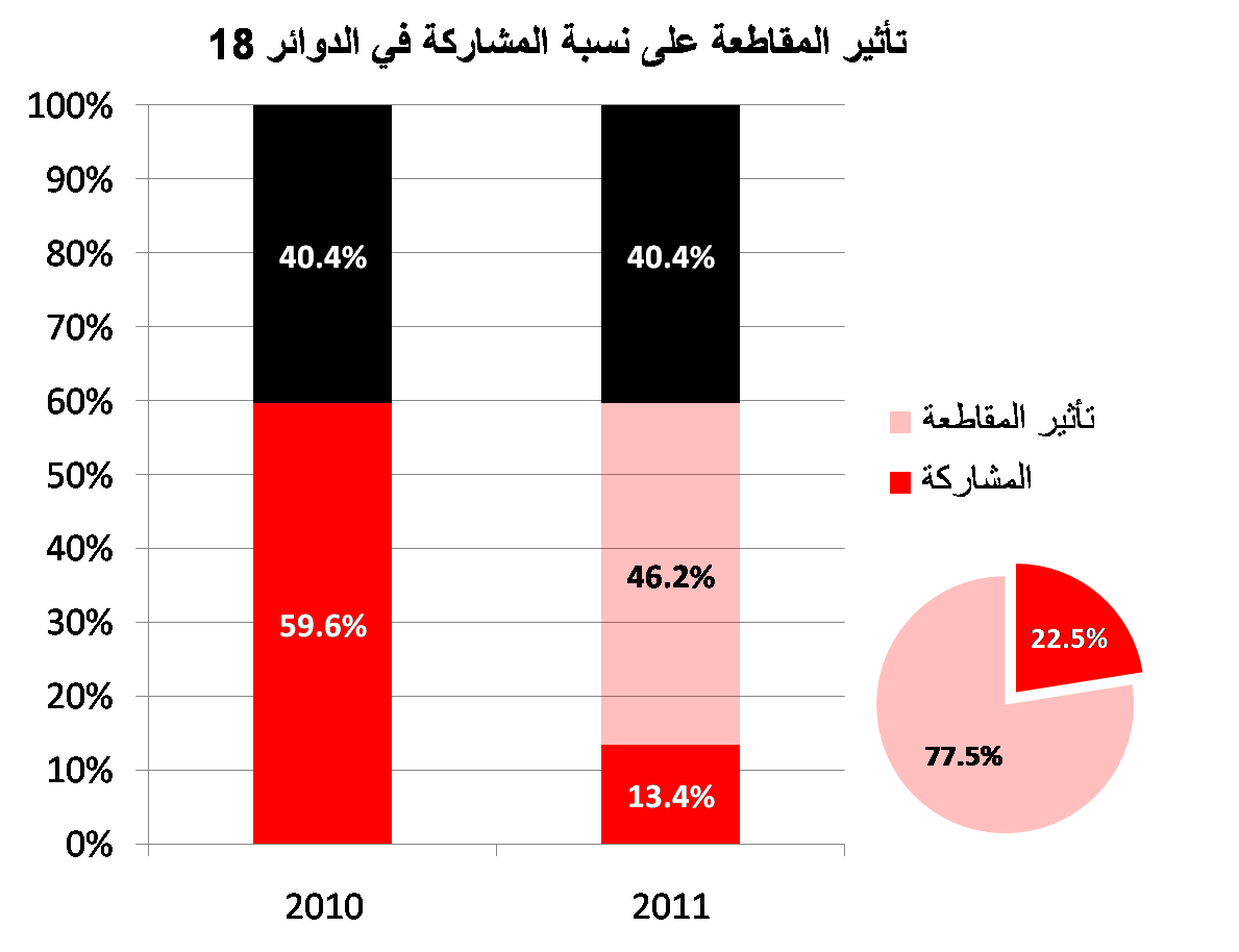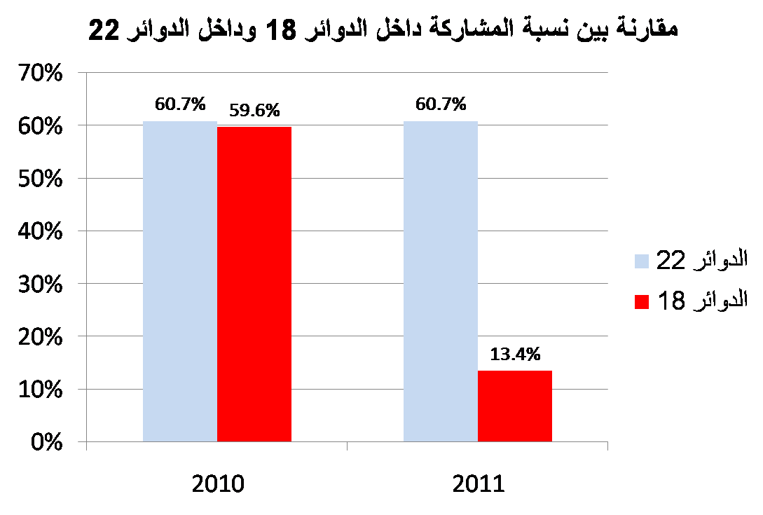وعلى هذا النحو، ومقارنة بنسبة المشاركة في هذه الدوائر في انتخابات 2010، فإن المشاركة في هذه الانتخابات قد سوّيت بالقاع، وخسرت أكثر من 77% من قيمتها السابقة، رغم مقاطعة مجموعات كبيرة للانتخابات السابقة بسبب أزمة خلية 25.