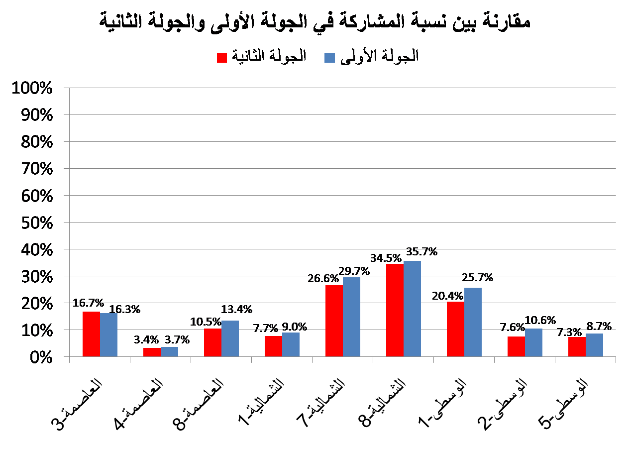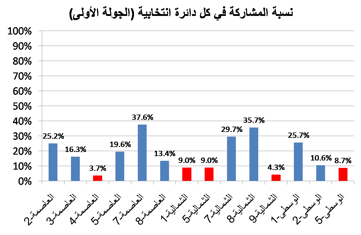 وتؤكد الإحصاءات أن 5 دوائر من أصل 14 دائرة جرت فيها الانتخابات، كانت المشاركة فيها لا تتعدى 10% فيما بلغت في دائرة سادسة 10.6% فقط في الجولة الأولى، وتراوحت المشاركة المترنحة في بقية الدوائر بينما هو أقل من 20% من الناخبين في 3 منها، وأقل من 30% في 3 دوائر أخرى، فيما شهدت دائرتان فقط مشاركة أكثر من 30%، وبلغ الحد الأقصى لنسب المشاركة في سابعة العاصمة ب 37.6%، فيما بلغت أدنى مشاركة في رابعة العاصمة ب 3.7% فقط.