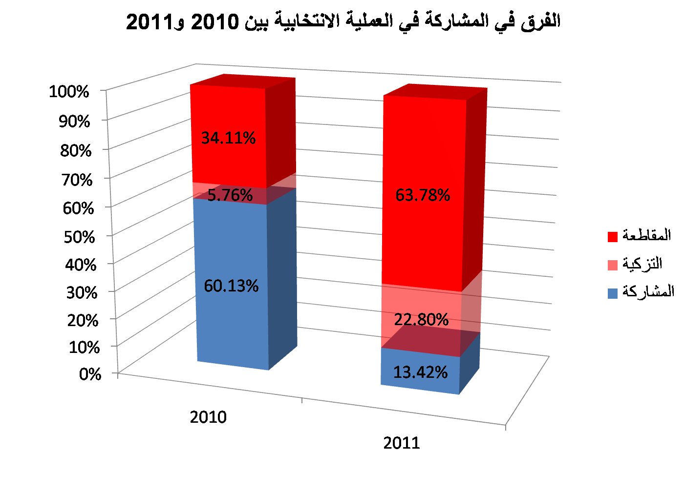 من جهة أخرى، فإن مقارنة نسبة المشاركة في هذه الانتخابات بانتخابات 2010 من حيث العملية الانتخابية، تكشف مدى سقوط هذه العملية، إذ حين تصل المشاركة في العملية الانتخابية عام 2010 إلى 60.13% فهي لا تتجاوز في عملية 2011 نسبة 13.4% أي بمقاطعة قاتلة تفوق 86%، ما ينزع الشرعية بشكل كامل عن هذه الانتخابات وعن السياق السياسي الذي تأتي فيه.