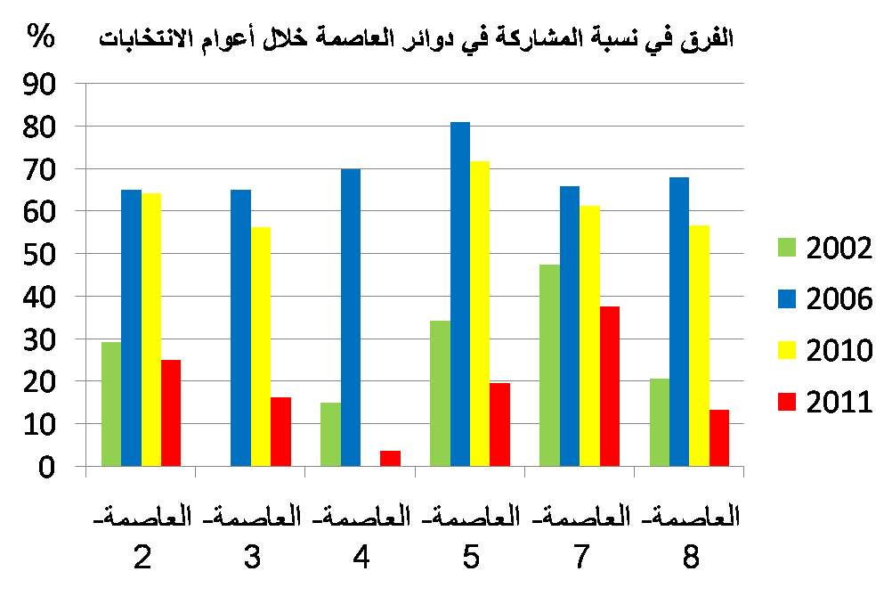وتكشف النتائج كذلك عيبا كبيرا يطال المشاركة في هذه الدوائر مقارنة بكل الانتخابات التي جرت سابقاً، إذ بلغت أدنى مستوى لها رغم ما شهدته الانتخابات الأولى عام 2002 من تحشيد واسع للمقاطعة، ويبلغ الفرق في بعض الدوائر أقل ب 95% عن انتخابات 2006 و2010 !!