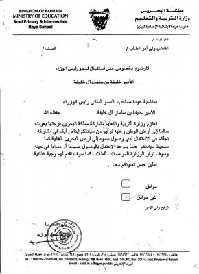مرآة البحرين (خاص): قامت وزارة التربية والتعليم بتوزيع رسائل على طلاب بعض المدارس في المحرق، تطلب موافقة أولياء أمور الطلبة على المشاركة في استقبال رئيس الوزراء خليفة بن سلمان آل خليفة عند عودته للبحرين.