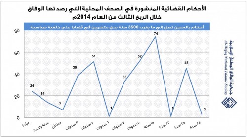 وأصدرت دور القضاء أحكاماً بالسجن تصل إلى ما يقرب 3500 سنة في حق 320 متهماً في قضايا على خلفية سياسية إلى جانب إسقاط الجنسية عن 18 مواطناً في قضيتين منفصلتين. كما تم رصد 8 انتهاكات تتعلق بالتضييق على الحريات الدينية.