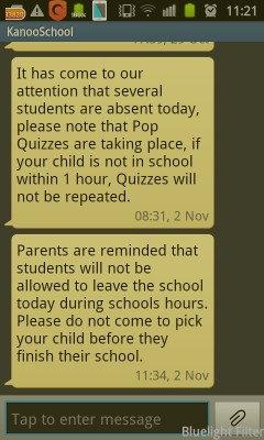 ففي الرسالة النصية الأولى اعتبرت إدارة المدرسة عدم جلب التلميذ الغائب للمدرسة خلال ساعة واحدة لتقديم الامتحان سيترتب عليه عدم اعادة الامتحان له، وفي رسالة نصية أخرى تذكير لاولياء الأمور بعدم السماح للطلبة للخروج من المدرسة خلال الدوام الرسمي، لذا لن يسمح لولي الأمر بالقدوم لاصطحاب ابنه خلال الوقت المدرسي.