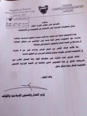 مرآة البحرين: تدوال ناشطون في وسائل التواصل الاجتماعي رسالة موقعة من وزير العدل ومرسلة لمجلس الوزراء تطالب بفرض عقوبات على المقاطعين للعملية الانتخابية التي تم إجراؤها في 22 نوفمبر/تشرين الثاني الجاري.