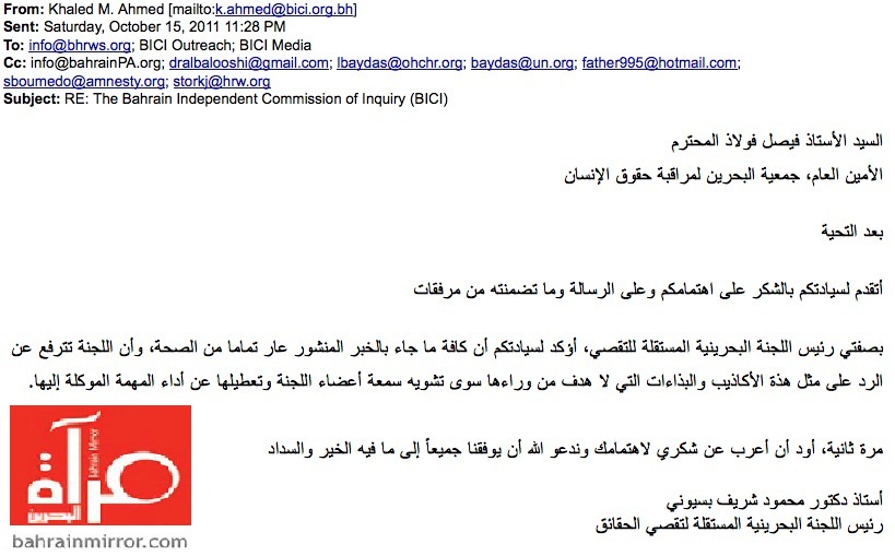 "بسيوني" يراسل "فولاذ" بشأن ما نشرته "مرآة البحرين": أكاذيب وبذاءات تهدف إلى تشويه سمعتنا