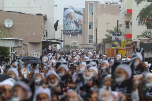 ورفع المتظاهرون لافتات منددة بالحكومة البحرينية، داعيةً المجتمع الدولي إلى التدخل لوقف التجاوزات بحق رجال الدين.