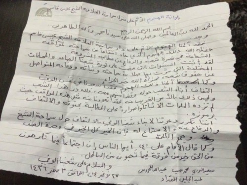 وقال البيان الموقع من آية الله الشيخ عبدالجليل المقداد والشيخ سعيد النوري والشيخ محمد حبيب المقداد والشيخ ميرزا المحروس "إن الهجوم على منزل الشيخ قاسم جاء انتقاما من مواقفه وشجاعته في الدفاع عن شعبه ومطالبه المشروعة".