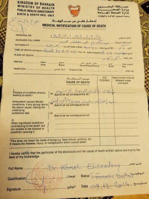 مرآة البحرين (خاص): أظهرت شهادة الوفاة للشهيد عبدالكريم البصري (72 عاما) أنه قضى بسبب رشات معدنية اخترقت رأسه وعنقه، في تفجير استهدف مسجدا للشيعة إلى الجنوب الغربي من العاصمة المنامة.