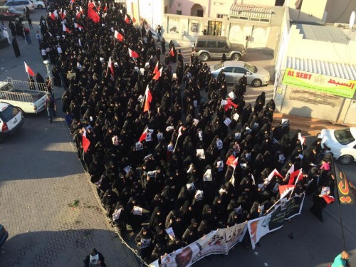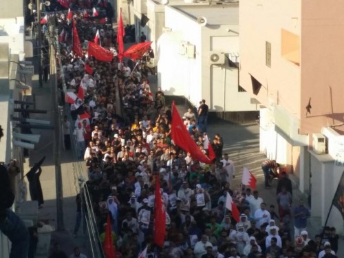 وردد المتظاهرون شعارات مناوئة للملك حمد بن عيسى آل خليفة الذي حملوه مسؤولية مقتل أكثرمن 150 شهيدا منذ إنطلاق حركة الاحتجاجات في (فبراير/ شباط 2011) سعيا لوضع حد لاستحواذ آل خليفة على السلطة.