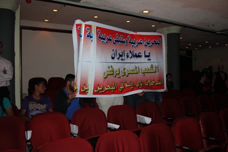 لدى القاء خليل المرزوق كلمته كضيف شرف، دخل بضعة اشخاص، جلسو مع الحضور رفعو لافتتين او ثلاث، بعضها يقول: ياعملاء ايران، وأخرى تقول: البحرين ليست لايران. خمسة اشخاص بالتمام والكمال جلسوا في وسط الحضور، ومجموعة اخرى اقل عددا جلست جهة اليمن من الحضور، رفعوا اللافتات بسرعة التقطوا لنفسهم صوراً، وما ان اقترب منهم احد المنظمين ليسالهم بهدوء أسقط في ايديهم، كانو مرتبكين وخائفين، لا يعلمون ما الذي يفعلونه في الموتمر بالضبط، سأل احد المنظمين صبياً كان يرفع لافتة مع اثنين آخرين: ما علاقتك بالبحرين؟، أجاب : أبي يعمل هناك. أين؟، ردّ: في شركة للبرول. ما اسمها: لا أعرف. ومن هذا الذي معك: هذا ابن خالتي. كان الصبي مرتبكا ويبعث على الاشفاق، لملم نفسه ورحل، ورحلت المجموعة الأخرى، بعد الرد المزلزل الذي وجهه لهم رئيس حزب التحرير خالد متولي يونس، الذي رفض التغاضي عن هذا المشهد المثير للاشفاق.خالد متولي يونس، وهو أحد قادة ثوار مصر في ميدان التحرير، قال “حدث أمر نرفض أن نغمض اعيننا تجاهه أو نتجاهله، أتحدث عمن كانو يريدون اتهام الثورة البحرينية ورفعوا لافتات هنا، نحن استمعنا لكلام الإخوة من البحرين، ولم نسمع منهم كلامًا دينيًا او طائفيًا، وهناك من اتى وحاول رفع لافتة فيها اتهام للثوار، نقول لهم نحن ايضا اتهمونا في التحرير باننا عملاء واننا ناكل الكنتاكي، نقول لهم لن تستطيعوا ان تمزقونا، نحن كلنا عرب، ونعرف اتهامات الانظمة كما اتهموا ثوار سوريا، وثوار ليبيا هم يحاولن اتهام الثورة البحرينية”، وكرد فعل طبيعي ردد الحضور هتاف “أمة عربية وحدة”.