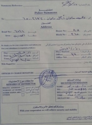 وطلبت منه المثول للتحقيق في العاشرة من صباح يوم غد الأحد 28 ديسمبر/كانون الأول في مكتب 99 بمبنى التحقيقات الجنائية في منطقة العدلية.