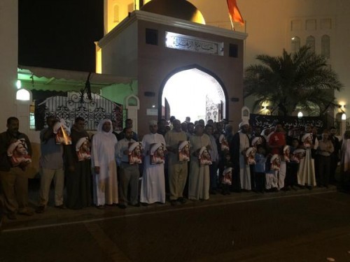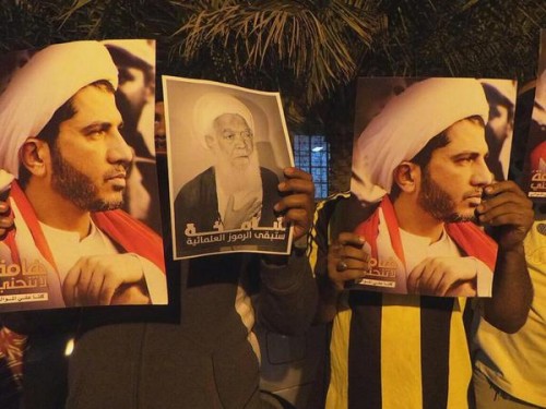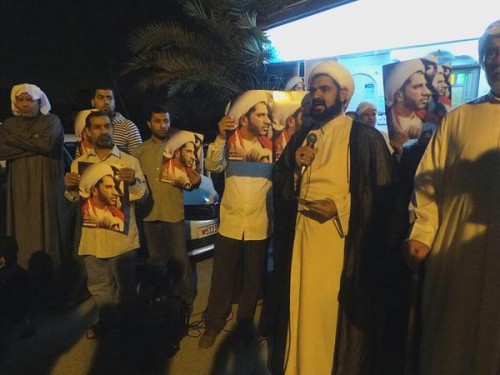 ورفع متظاهرون يافطات حملت صور الشيخ علي سلمان والشيخ الجدحفصي، مؤكدين على أن المساس بالعلماء وبالرموز السياسية والدينية يمثل ذهاب بالبحرين إلى المجهول.