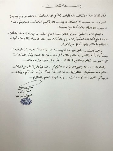 ونصح الصدر في بيانٍ له أمس الأحد 28 ديسمبر/كانون الأول الجهات المختصة "بالإفراج عنه وإلا كان اعتقاله بدايةً لنهاية النظام الظالم وإنهاءً لمبدأ الحوار" على حد قوله.