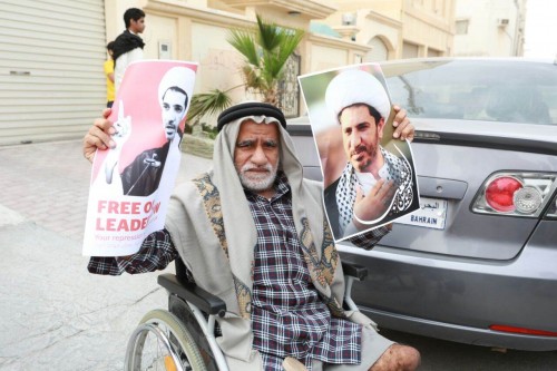 ورفع المتظاهرون الذين وصلوا للشوارع العامة صوراً للشيخ علي سلمان، مطالبين بالافراج الفوري عنه.