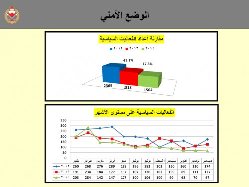 واستعرض الوزير خلال اللقاء «عددا من الإحصائيات الأمنية وذلك بمقارنتها بين الأعوام 2012 و2013 و2014 والتي أكدت تحقيق مستوى أمني متقدم نتيجة تعزيز السيطرة الأمنية، حيث شهد العام 2014 تراجعا في أعداد الفعاليات السياسية والمشاركين فيها».